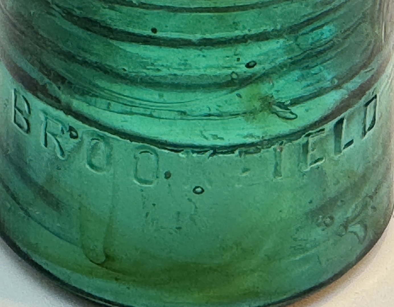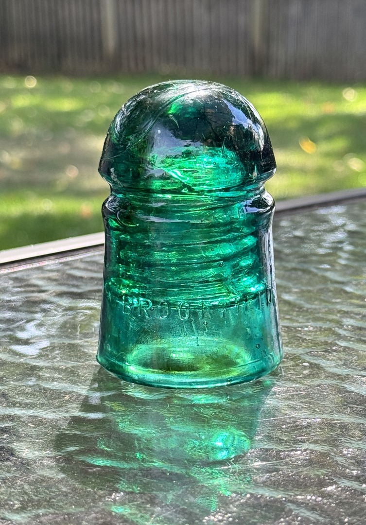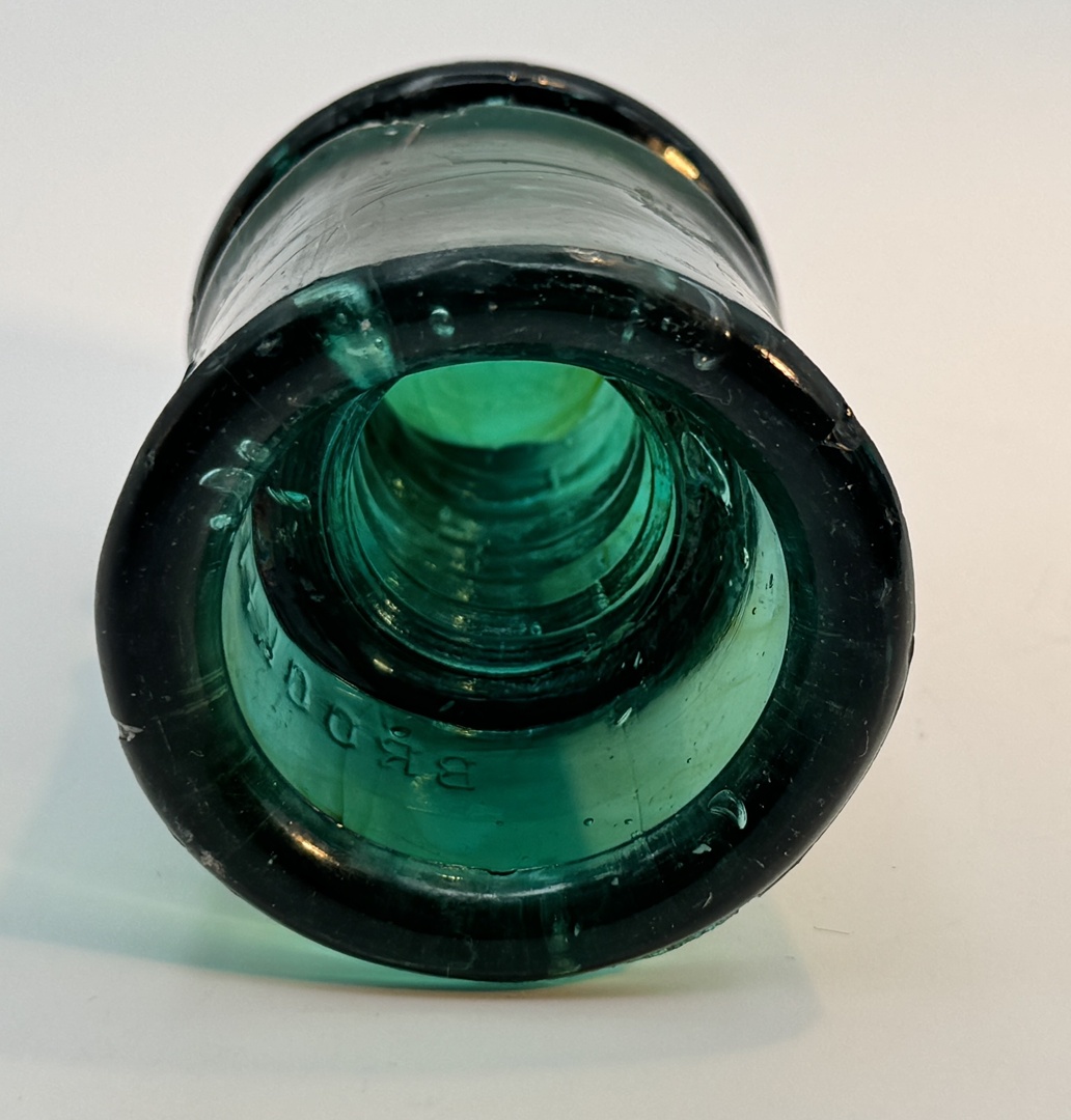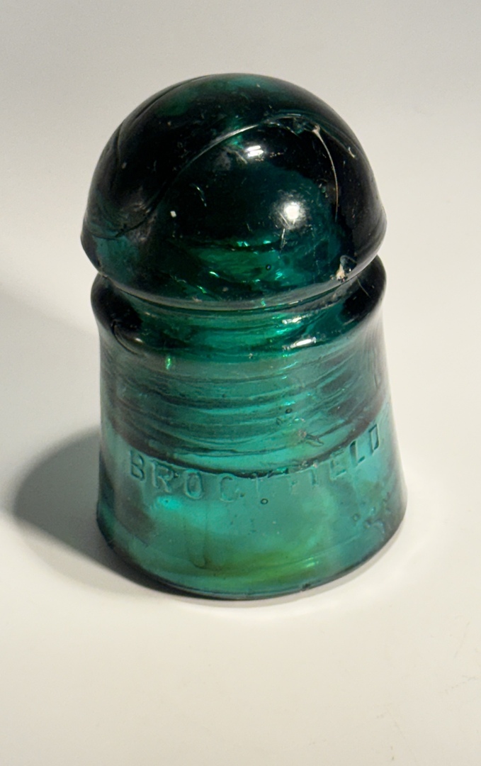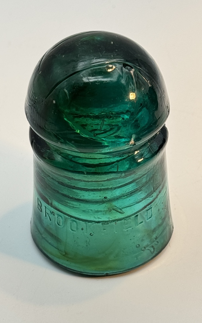 This Brookfield insulator is a beautiful example of early telecommunications history. The deep green color is particularly rare and eye-catching, making it a standout piece even with its wear and tear. It would be a fantastic addition to a vintage glass collection or as a unique decorative item.
