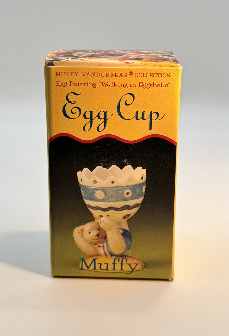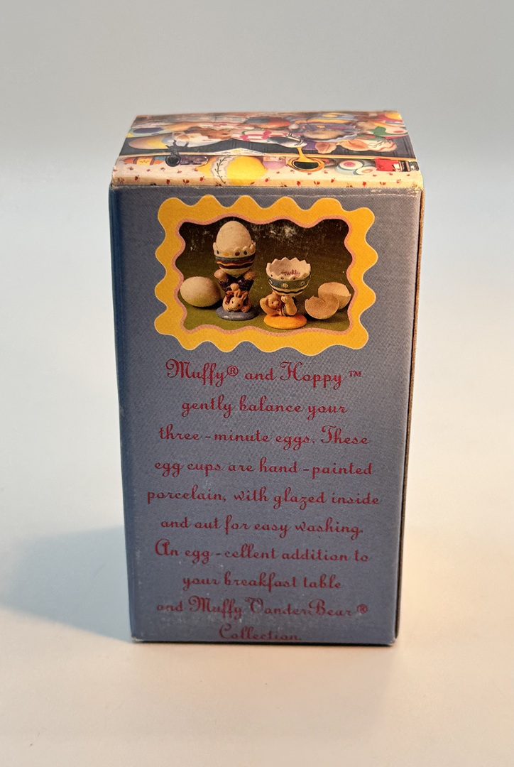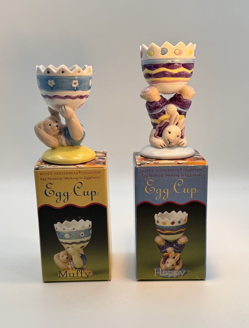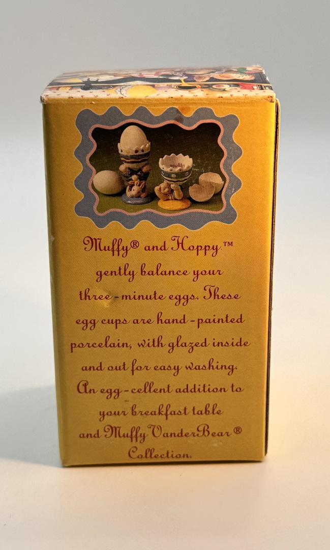 Discover this charming lot of two vintage 1993 Muffy Vanderbear Collection egg cups, still in their original boxes! These delightful porcelain figurines, Muffy the bear and Hoppy the bunny, are designed to hold your hard or soft-boiled eggs with whimsical charm. Each piece is hand-painted with pastel colors and glazed for easy washing, making them both functional and decorative.