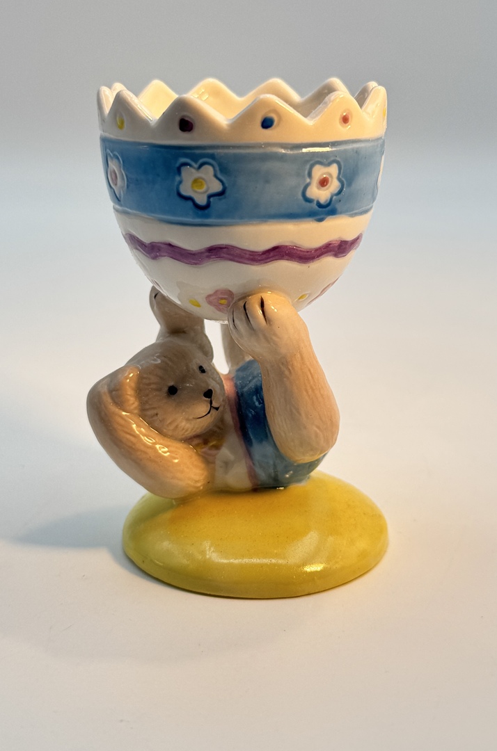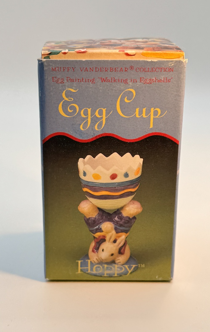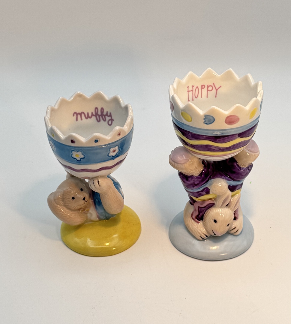 • Specific Items: Two egg cups – Muffy the bear (3 1/2″ tall) and Hoppy the bunny (3 3/4″ tall)