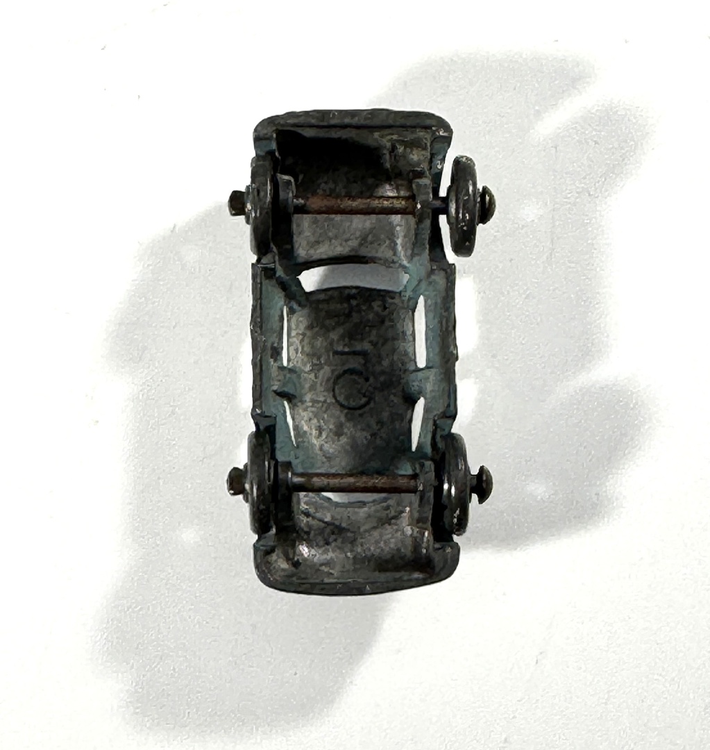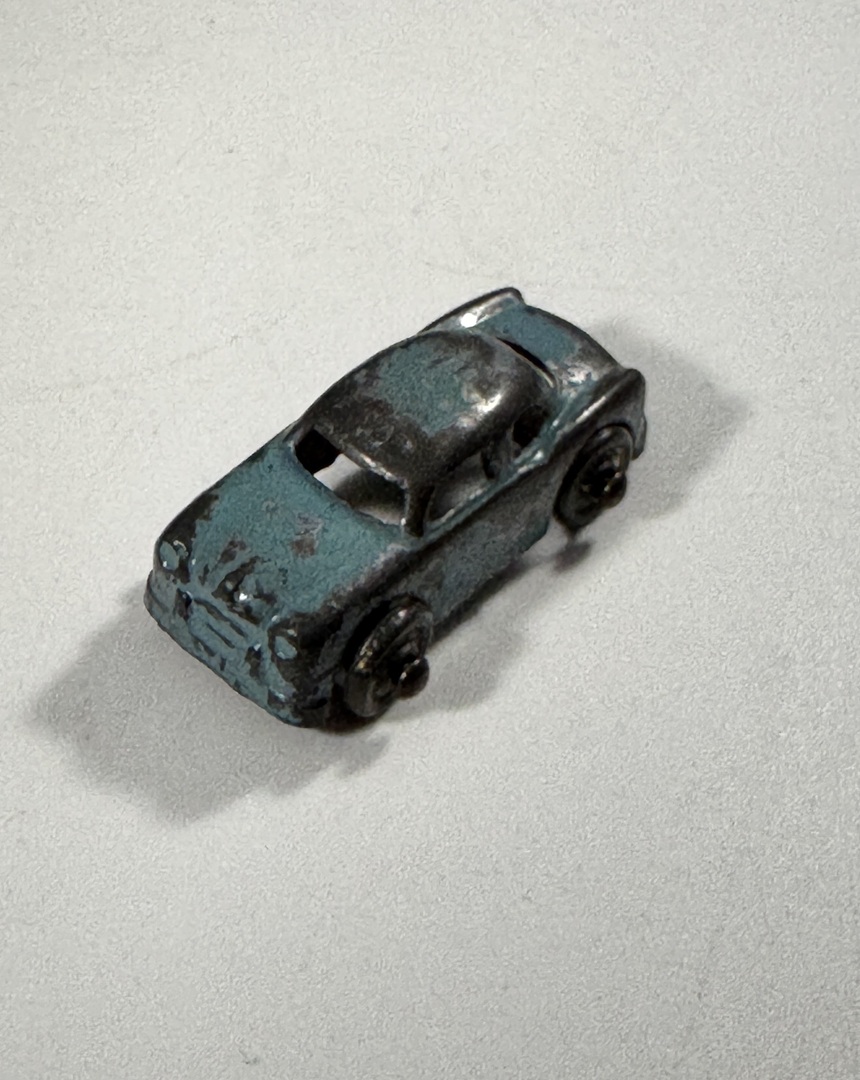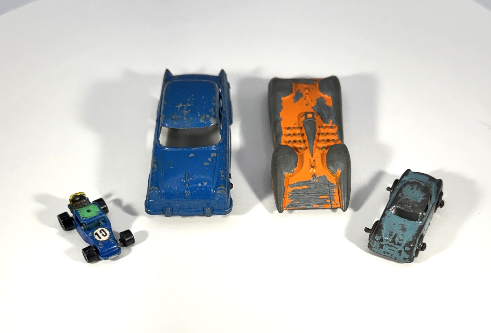 • 4 cars: orange Goodee racer, blue Tootsietoy Ford, light‑blue sedan, blue Ideal Toy Corp buggy
