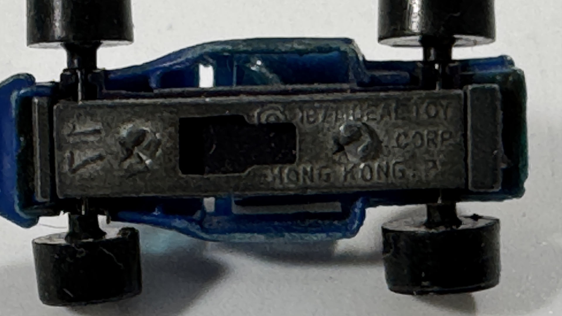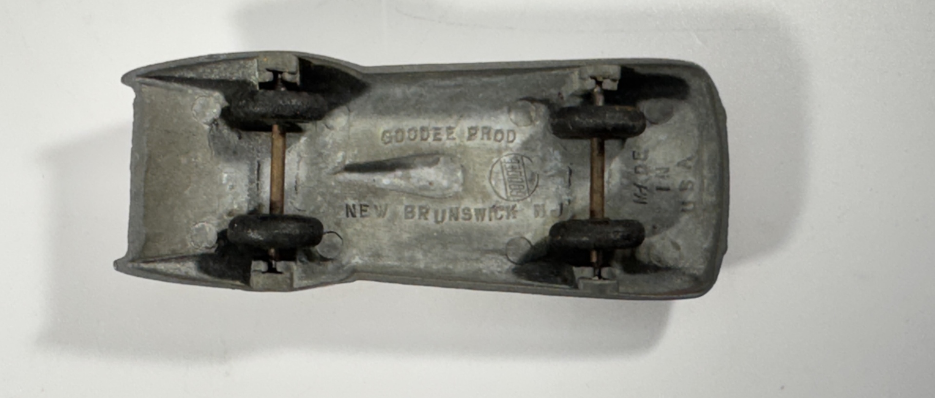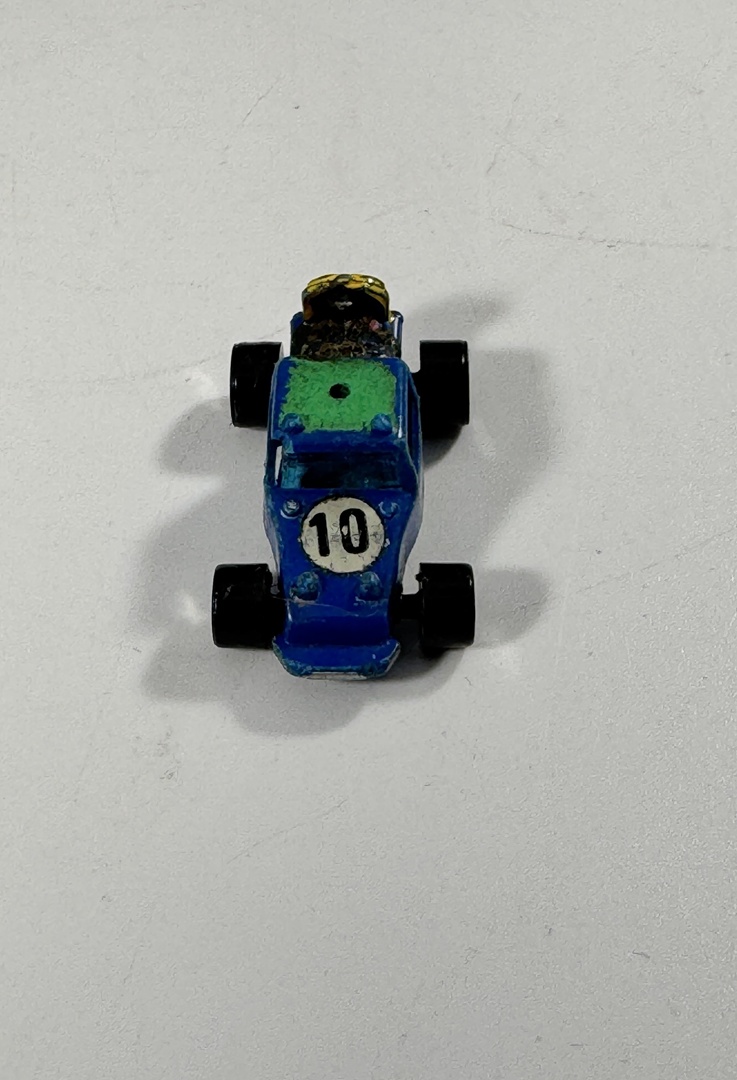 • 4 cars: orange Goodee racer, blue Tootsietoy Ford, light‑blue sedan, blue Ideal Toy Corp buggy