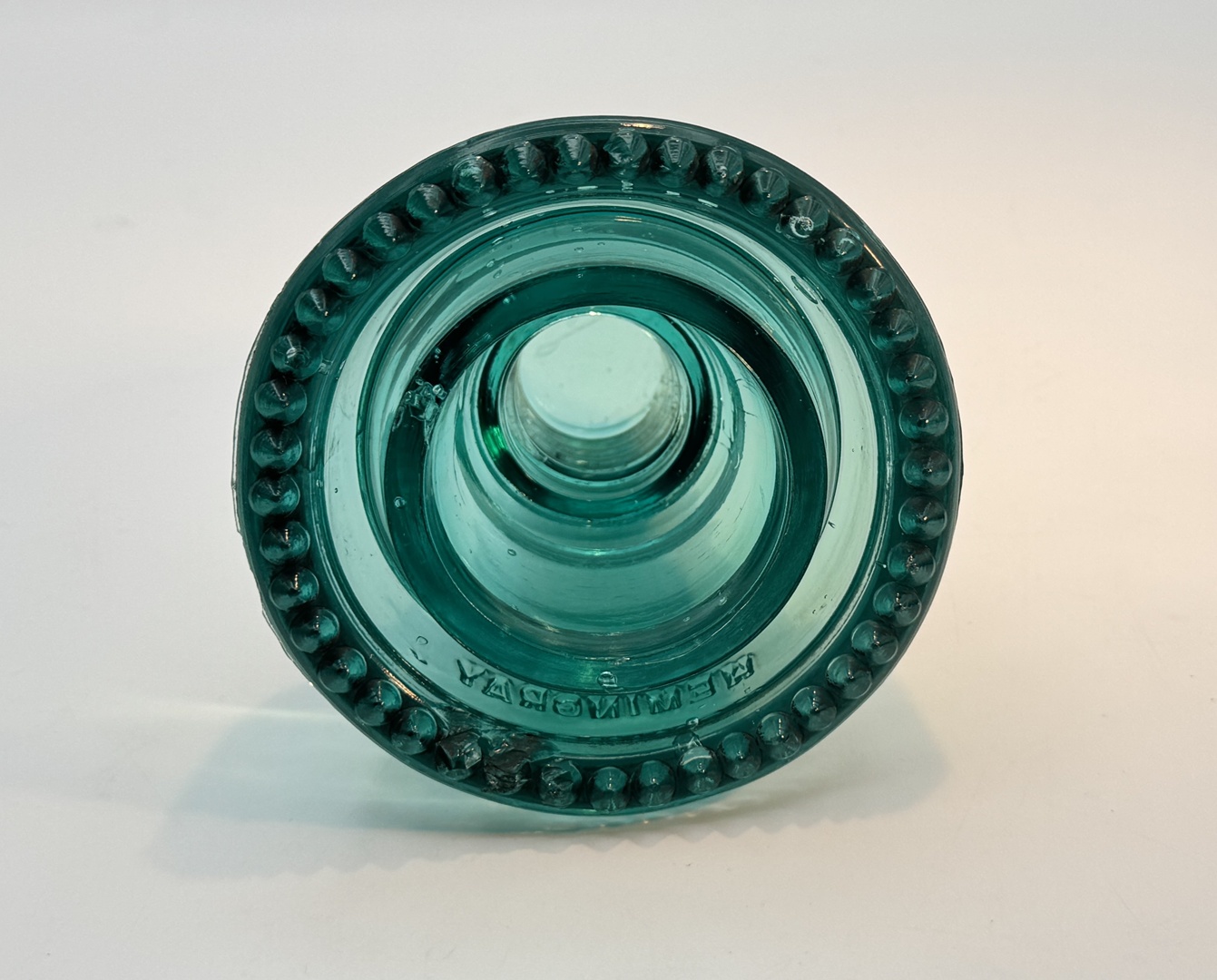 This insulator is in excellent condition with a couple minor chips on the bottom, preserving its beauty and integrity. The embossing on the glass is distinctly visible, enhancing its collectible value.