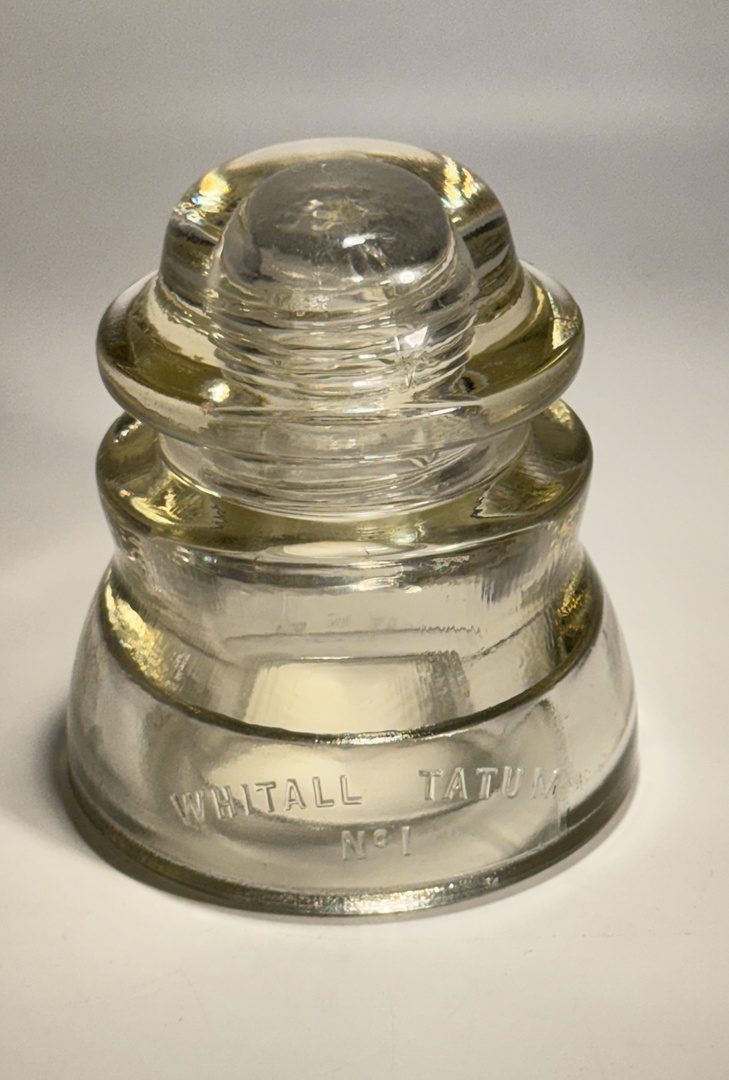 Discover this rare and highly collectible vintage Whitall Tatum CD insulator, a piece of telecommunications history. This insulator is in near mint condition, featuring clear glass that is free from cracks, chips, or significant imperfections. The embossed markings on the insulator include “WHITALL TATUM / No1” on one side and “MADE IN U.S.A. 14-41” with a circled “A” on the other, indicating it was produced in 1941. The clear glass and excellent condition make this a standout piece for any collector of vintage insulators.