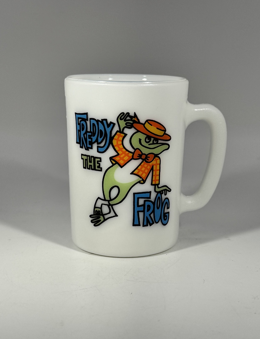 Add a splash of mid‑century charm to your collection with this pristine Avon “Freddy the Frog” milk‑glass mug. Produced in the late 1960s, the cup originally accompanied children’s bubble bath sets, making it a delightful piece of nostalgic kitchenware. The clear white milk glass showcases a playful illustration of Freddy, a green frog donning a bright yellow/orange hat and a stylish bow tie, rendered in soft, muted tones that age beautifully.