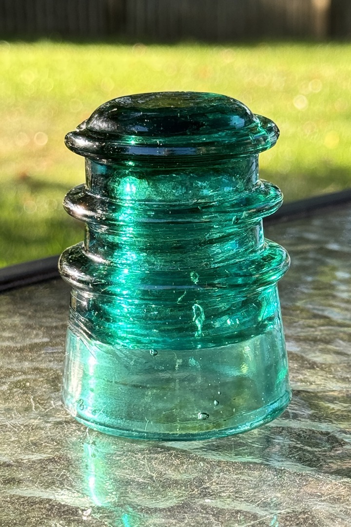 This charming vintage Brookfield insulator boasts a beautiful aqua green color and distinctive double-ring design. With dimensions of 3 ¼” x 2 ¼”, this piece is smaller and offers a unique look. While exhibiting a ½” chip in the top ring, it retains its vintage charm and character.