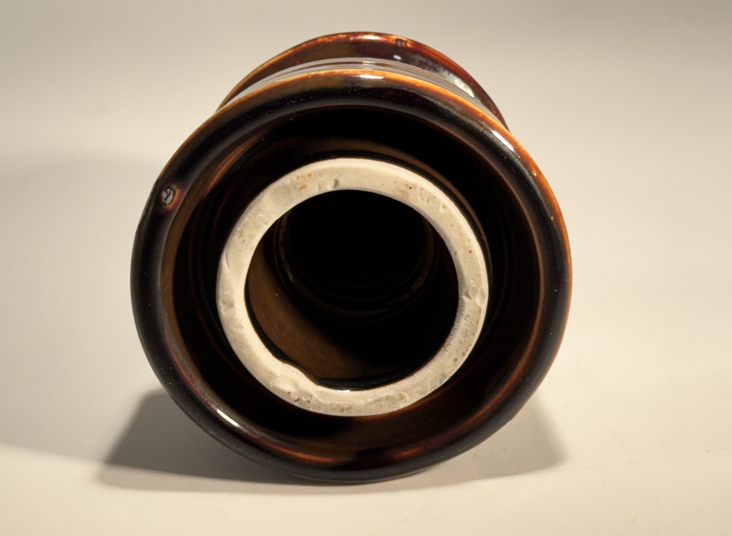 Discover this vintage brown porcelain insulator, a classic piece of early electrical or telegraph history. This insulator features a rich brown glaze and the iconic “cake design” shape, making it a sought-after item for collectors of antique insulators and industrial decor enthusiasts. The insulator measures approximately 3 1/2 inches by 3 1/4 inches and is in fair condition, with a 3/4″ chip on the side and signs of weathering typical of its age.