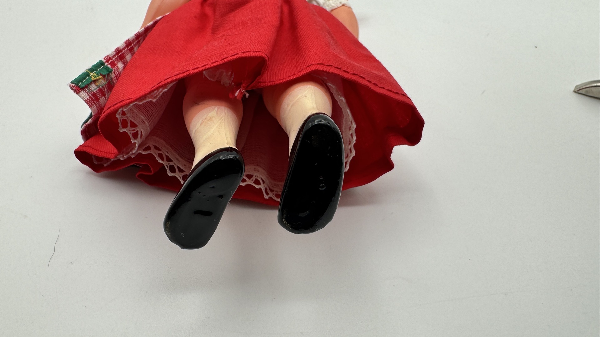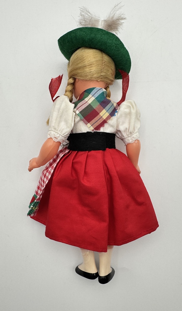 Discover this charming vintage German Trachten doll, dressed in a traditional Bavarian Dirndl costume. This 8-inch doll is in very good vintage condition, with a well-preserved costume and no major visible damages. The doll’s head may be made of celluloid, while the body appears to be plastic, a common combination for mid-20th-century dolls.