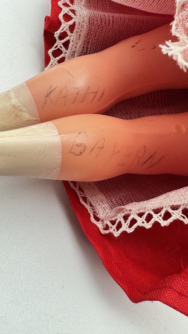 A unique detail is the previous owners handwritten name “Kathy Bayern” on the legs, a testament to the doll’s previous ownership and the love it received. Based on online research, this doll may be associated with the “Original Schmider Trachten” brand, known for its authentic German folk costumes.