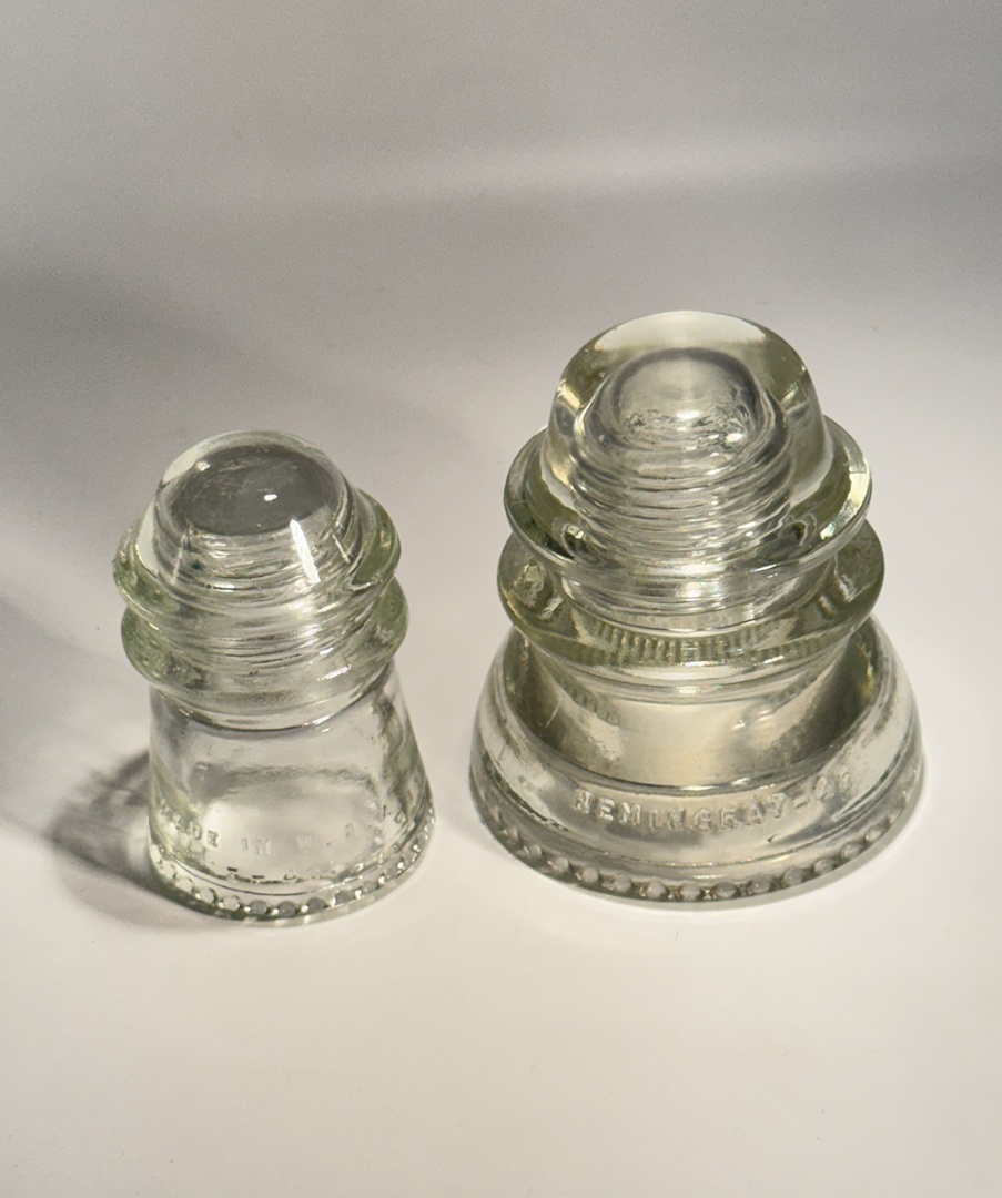 Own a piece of American history with this charming lot of two vintage Hemingray insulators. These clear glass insulators, marked with their respective numbers (#42 and #9) and ‘MADE IN USA’, represent a classic era of American infrastructure. They offer a tangible connection to the past, perfect for collectors and enthusiasts.