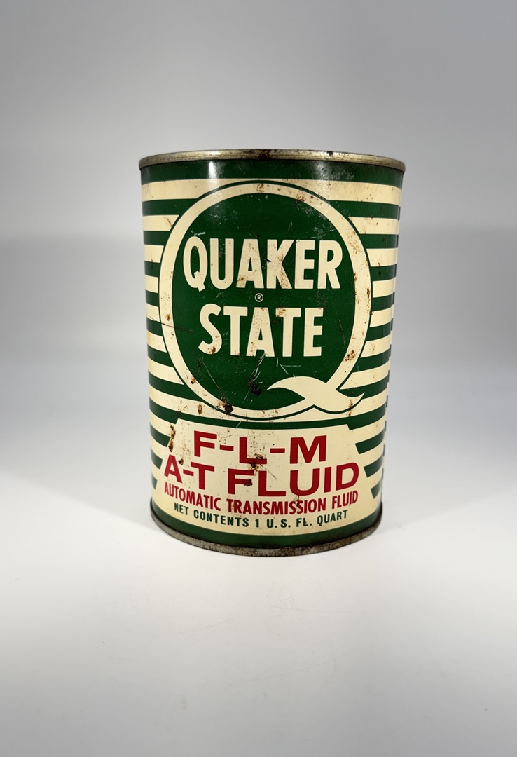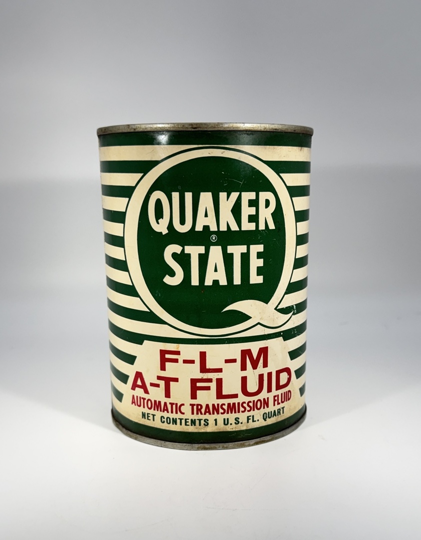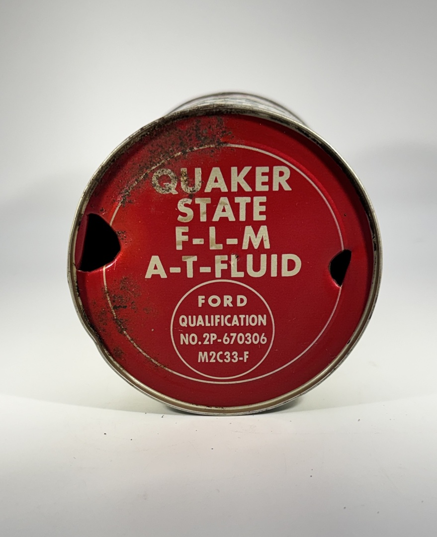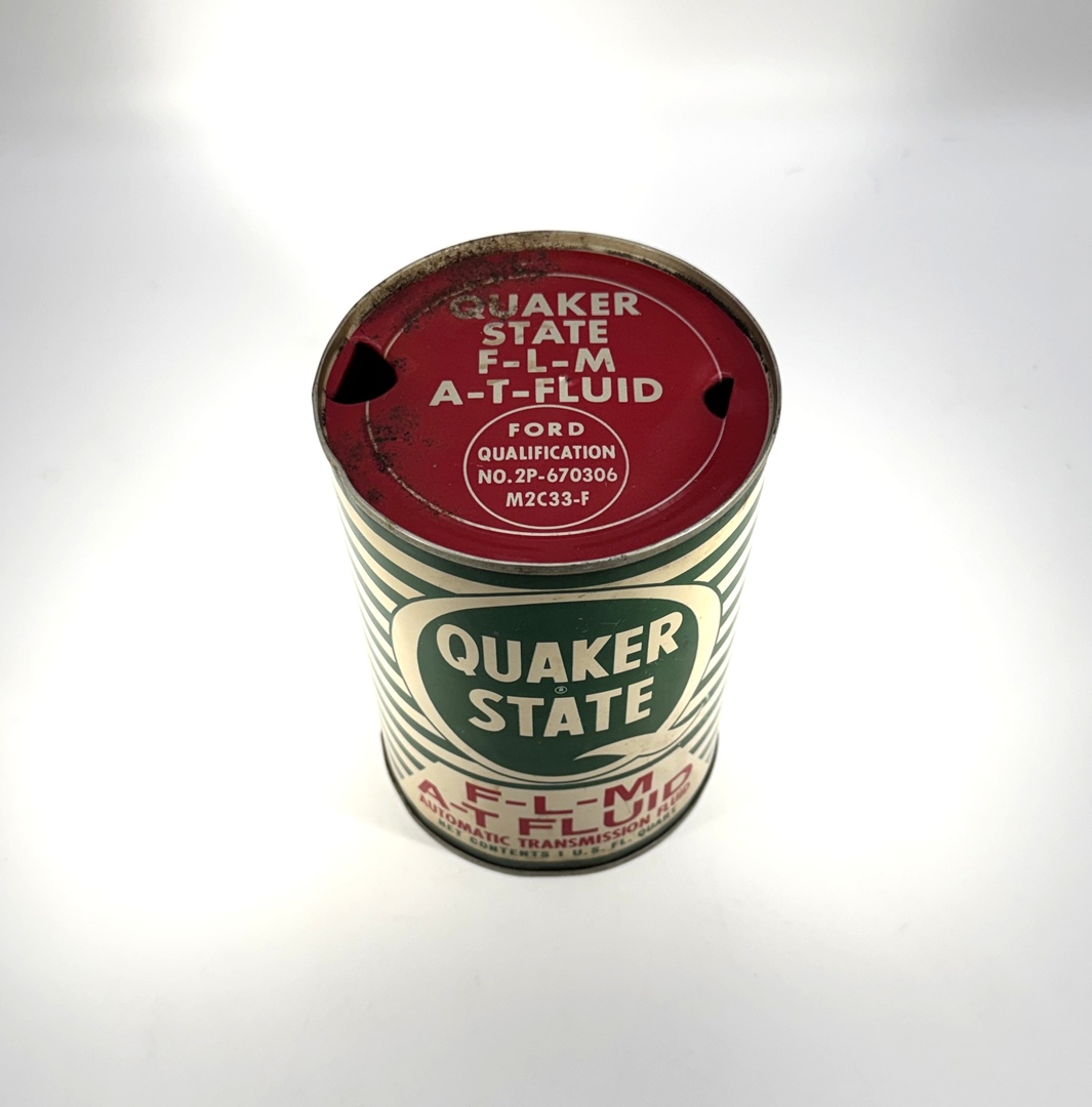 Discover this rare and collectible vintage Quaker State tin can, specifically designed for Ford vehicles. This 32-ounce can contains “Ford F-L-M A-T Fluid,” a specialized automatic transmission fluid from the mid-20th century. The can features a striking dark teal/green and white color scheme, with classic Quaker State and Ford branding. It measures 5 1/2″ tall by 4″ in diameter, making it a perfect addition to any automotive or vintage collection.