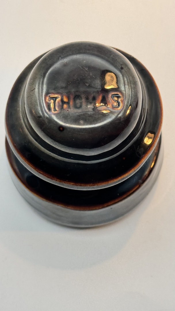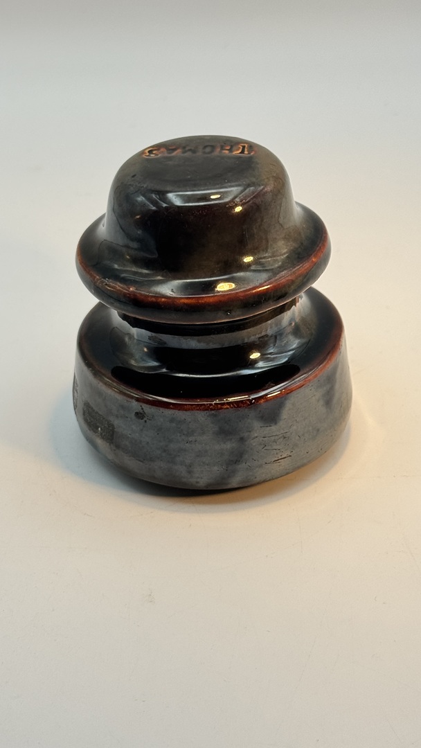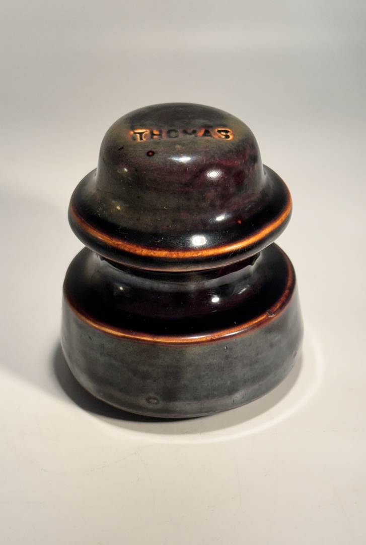 Offering a rare and highly collectible Thomas Insulator in excellent condition. This vintage porcelain insulator features a rich chocolate brown glaze and the classic “Cake Design” (CD) style, making it a standout piece for any insulator or telegraph/telephone collector. The insulator is stamped “THOMAS” on the top, indicating its origin from the renowned Thomas Insulator Company.
